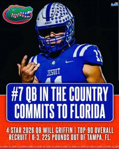 The Florida Gators are making significant strides in their 2026 recruiting efforts, particularly in securing top quarterback talent. A notable commitment is from Will Griffin, a four-star quarterback from Tampa Jesuit High School. Standing at 6-foot-3 and weighing 225 pounds, Griffin is ranked as the 10th-best quarterback in the 2026 class and the 167th overall player nationally, according to 247Sports. His junior season was impressive, amassing 3,404 passing yards and 34 touchdowns, showcasing his potential to be a game-changer for the Gators.